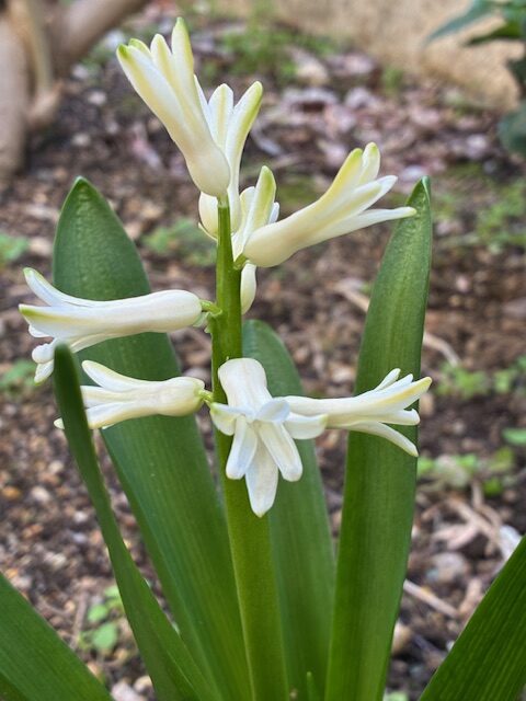 白のヒヤシンスの花言葉は「控えめな愛らしさ」。